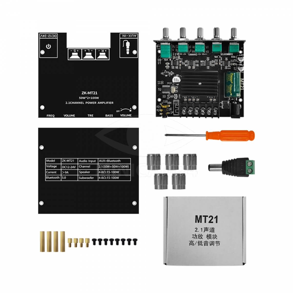 2,1-канальный Bluetooth 5.0 усилитель сабвуфера ZK-MT21 – это современное устройство, которое обеспечивает мощное и качественное звучание для аудиосистем. Усилитель поддерживает двухканальный стерео-звук и сабвуфер, что делает его идеальным выбором для домашних кинотеатров, компьютеров, автомобильных систем или колонок. С мощностью 50 Вт для правого и левого каналов и 100 Вт для сабвуфера, он позволяет воспроизводить глубокие басы и четкие высокие частоты.